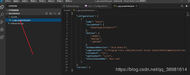 箭头是新出现的文件夹,点击打开就会发现一个文件:c_cpp_properties.json,我们点击打开他查看代码如图:
