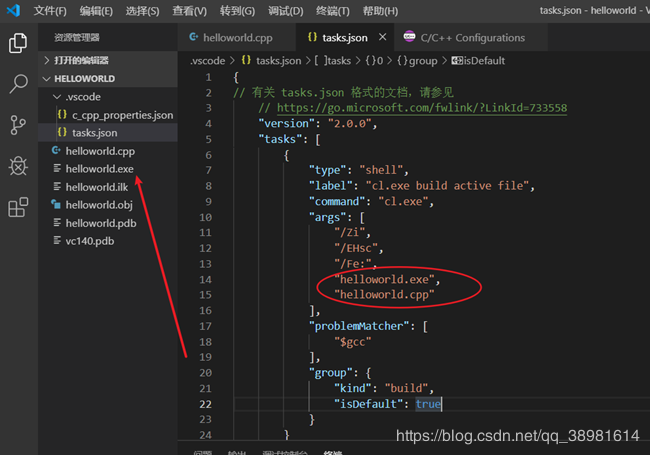 5、点击打开这个tasks.json查看代码: 别的都不需要修改,只把图中圈起来的 两个文件名 修改为对应的即可,如本例的