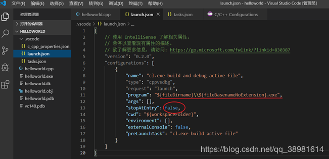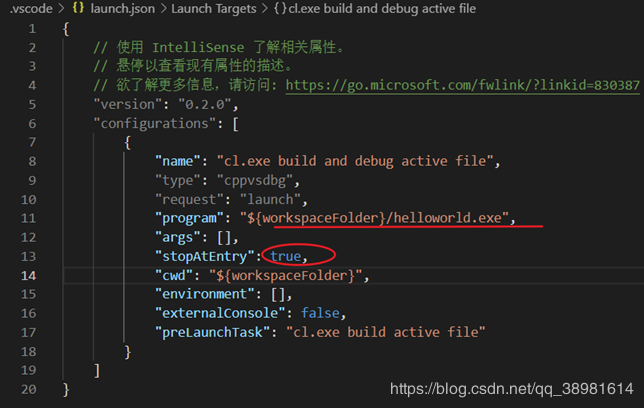 2、stopAtEntry值设置为true使调试器在该断点上停止。最好为true