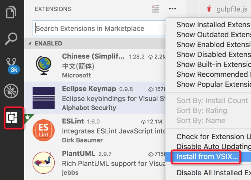 生成好的vsix文件不能直接拖入安装,只能从扩展的右上角选择Install from VSIX安装: