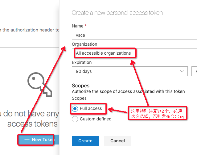 点击创建新的个人访问令牌,这里特别要注意Organization要选择all accessible organizations,Scopes要选择Full access,否则后面发布会失败。