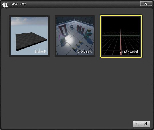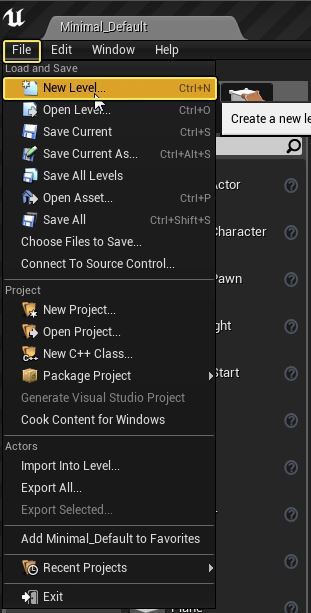 接下来我们将创建一个新的 Level,在那里建立我们的游戏环境。有几种不同的方法可以创建一个新的 Level,我们将使用文件菜单的方法,其中列出了关卡选择选项。
