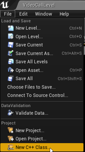 回到 Unreal 编辑器,再创建一个新的 C++类,命名为 VideoCall.h。然后进入VideoCall.h文件,添加一下接口: