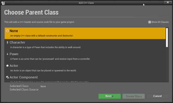 在 Unreal 编辑器中,选择 File->Add New C++ Class。