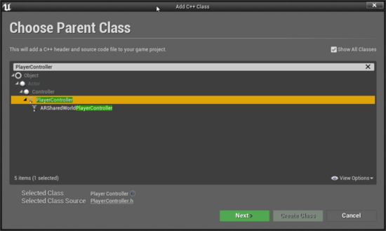 创建一个AVideoCallPlayerPlayerController的bluepringt。右键点击内容,按Add New按钮,选择Blueprint类,在窗口中选择父类,在Pick parent类进入All classes部分,找到VideoCallPlayerController类。