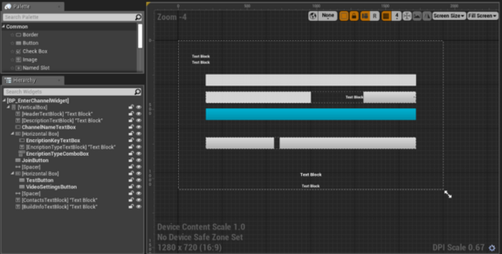 更改这个新的用户小工具的类的父类。打开 Blueprint,会出现 UMG 编辑器界面,默认情况下 Designer 选项卡是打开的。点击图形按钮(右上角按钮),选择 "类设置"。在面板 "Details "中,点击下拉列表 "父类",选择之前创建的C++ 类 UEnterChannelWidget。现在返回到设计页面。调色板窗口包含几种不同类型的小部件,你可以用它们来构造你的 UI 元素。找到 Text、Editable Text、Button 和 ComboBox(String)元素,然后将它们拖到工作区,如图中所示。然后进入 "EnterChannelWidget.h "文件中的 UEnterChannelWidget 的定义,查看成员变量的名称和对应的类型(UTextBlock、EditableTextBox、UButton和UComboBoxString)。返回到 BP_VideoCallWiewVidget 编辑器中,给你拖动的UI元素设置相同的名称。你可以通过点击元素并在 "详细信息 "面板中更改名称来完成。尝试编译蓝图。如果你忘了添加什么东西,或者在你的UserWidget类中出现了widget名称/类型不匹配的情况,你会出现一个错误。