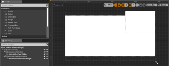创建 BP VideoCallViewWidget Asset ,将父类设置为 UVideoCallViewWidget,并添加 BP VideoViewWidget 类型的 UI 元素MainVideoViewWidget 和ExtendedVideoViewWidget。同时添加 SizeBox 类型的 MainVideoSizeBox 和 AdditionalVideoSizeBox UI 元素。