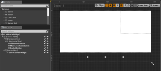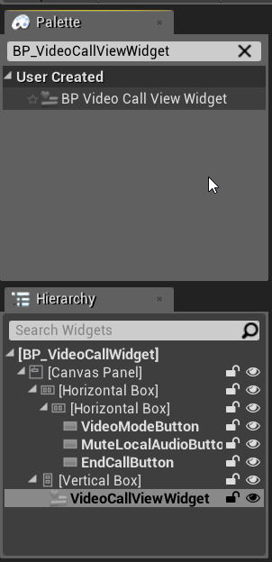 创建BPVideoCallWidget Asset,将父类设置为UVideoCallWidget,在 Palette UI 元素BPVideoCallViewWidget 中找到并添加名称为VideoCallViewWidget,添加 EndCallButton、MuteLocalAudioButton 和 VideoModeButton 按钮。