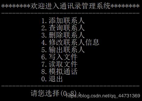 之前利用C语言完成了一个关于个人通讯录管理系统的课题,主要是关于联系人的添加、查找、删除、修改、输出以及文件的写入与读出,还有一个甜点功能—模拟通话,它的实现原理也很容易理解,文章末尾会介绍到。