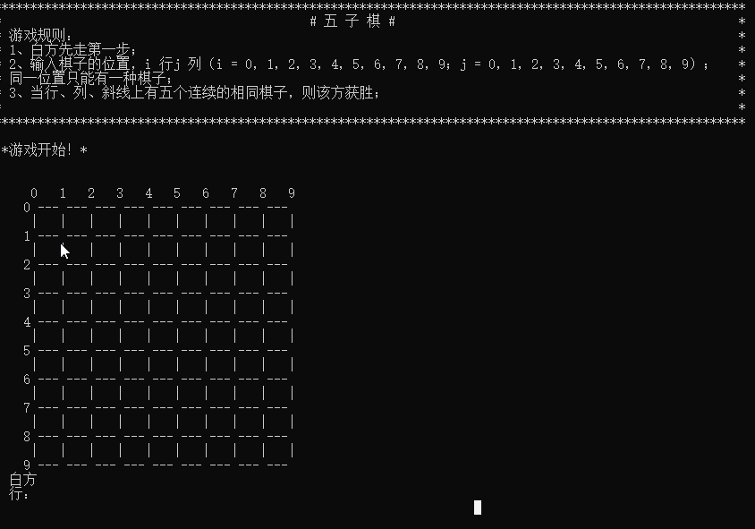 cout << "* 2、输入棋子的位置,i 行j 列(i = 0,1,2,3,4,5,6,7,8,9;j = 0,1,2,3,4,5,6,7,8,9); *" << endl;