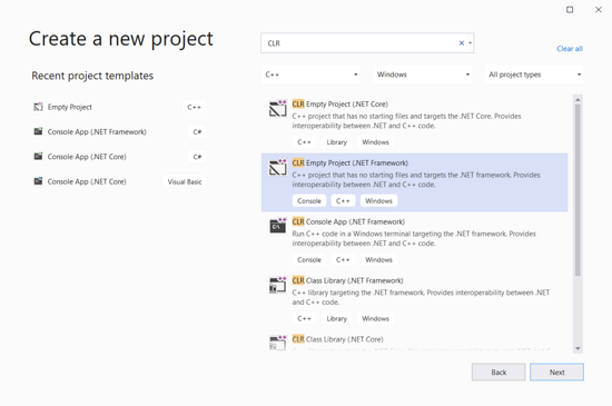 接下来我们可以创建项目了,建议选用模板 CLR Empty Project (.NET Framework) ,解决方案和项目名可以都用 CppWpfDemo 。
