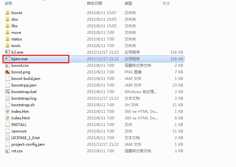 执行会发现当前文件夹中增加了几个文件,找到其中的bjam.exe,如下图所示