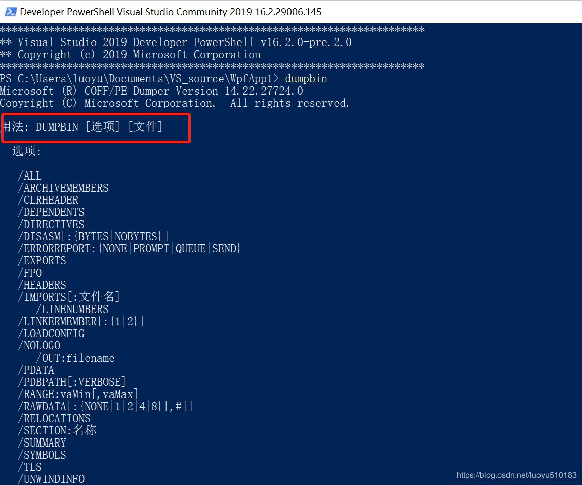 2.打开以后应该如下图所示,首先输入dumpbin查看下用法: