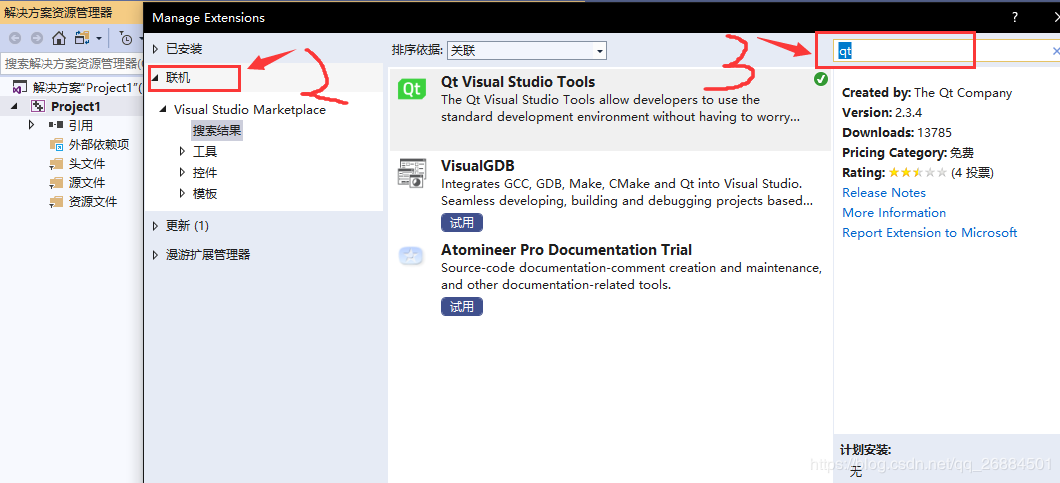 点击拓展--管理拓展--联机--搜索qt--下载