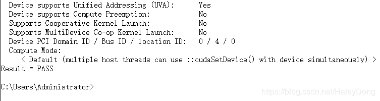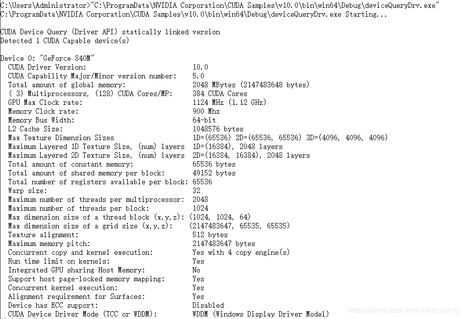 结果如下图,我们得到了本机的GPU硬件信息。注意:关注第二行计算能力,可以看到这台机器的计算能力是5.0。