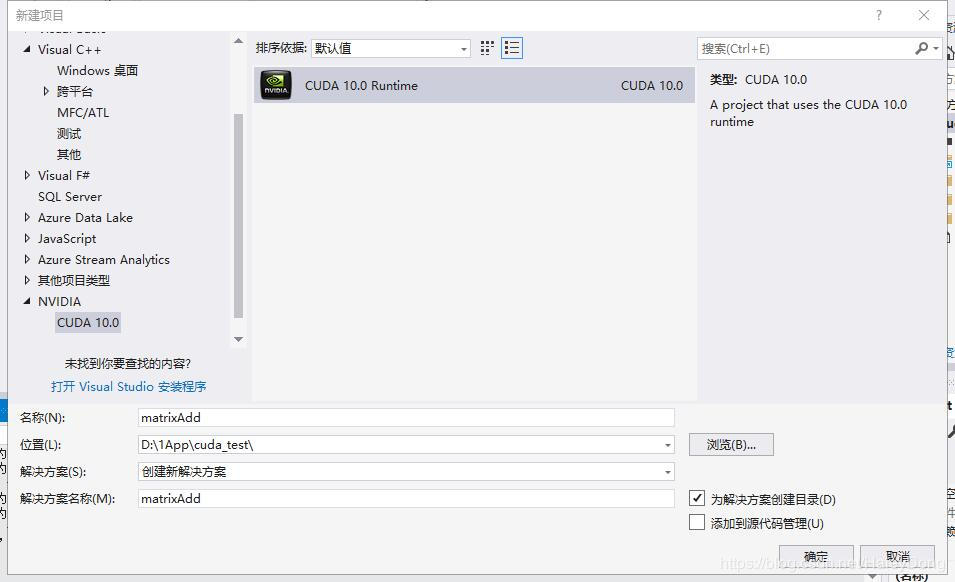 直接新建一个CUDA 10.0 Runtime 项目。如图(注意图中文件命名与本例无关,无需参考),