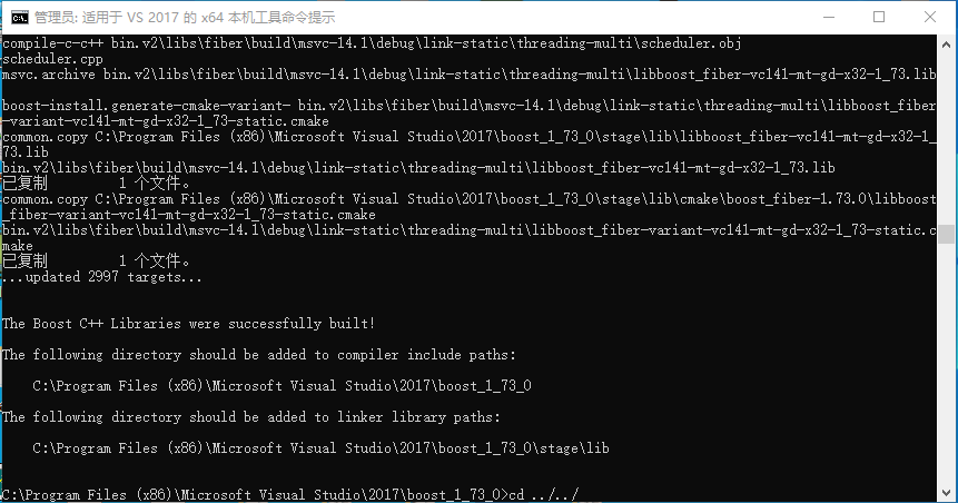 // 工程:属性 =》配置属性 =》链接器 =》常规 =》附加库目录 填上:C:\Program Files (x86)\Microsoft Visual Studio\2017\boost_1_73_0\stage\lib
