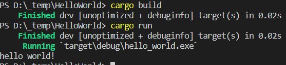 选择一个终端,在其中输入cargo build,如果你只看到一行开头是绿色的字,类似 Finished dev [unoptimized + debuginfo] target(s) in 0.02s,没有报错的话,那接着运行cargo run,否则就要看看之前的步骤是不是哪里错了。