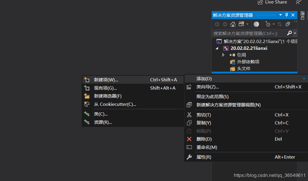 1,首先我们在vs2019中创建了工程以后(我所创建的工程名称为“xiangmu”),右键“源文件”,点击添加——新建项。(创建工程的细节不再说。)