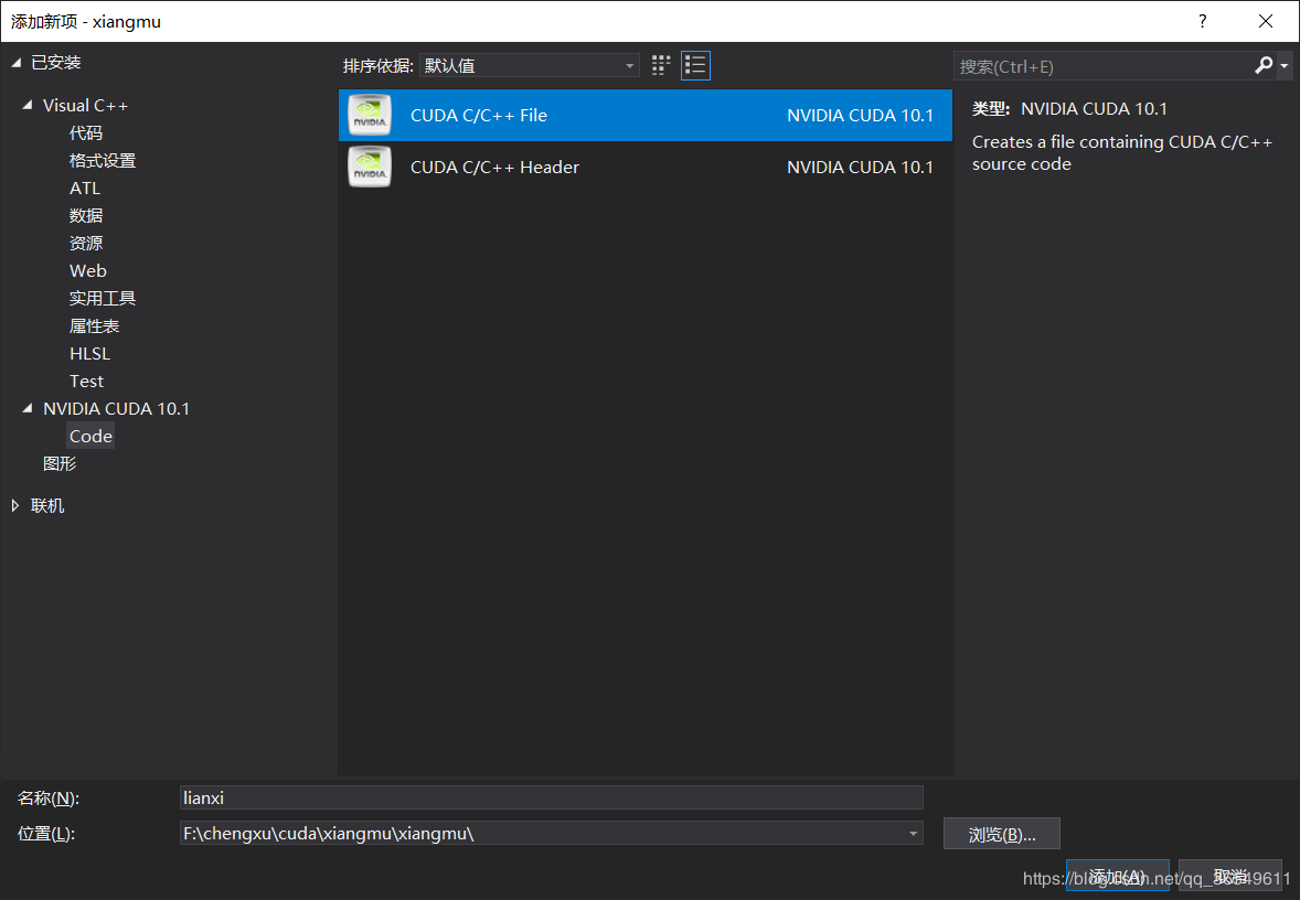 2,点击NVIDIA CUDA 中的Code,选中CUDA C/C++,并创建文件名,比如“lianxi”。(如果选择的是C++的代码,会显示.cpp文件,可以创建C++的文件)。