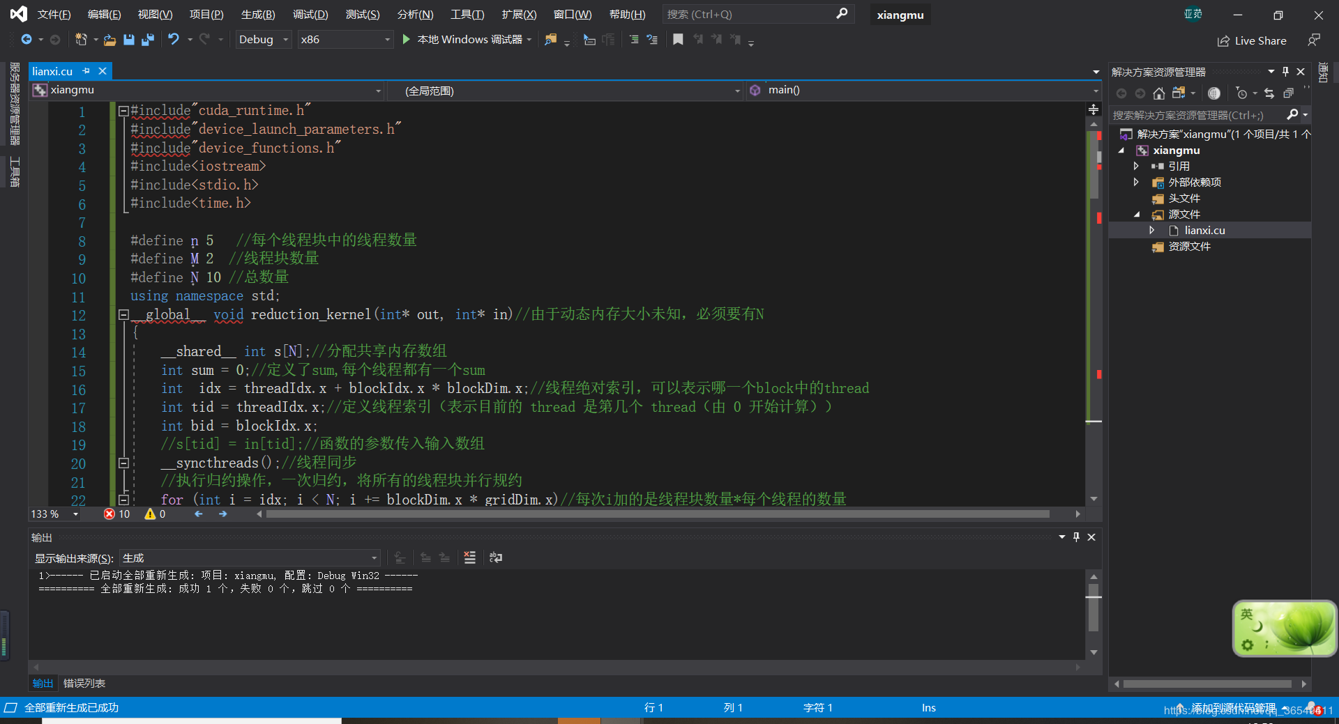 3,在此用一个简单的CUDA规约程序进行示范,选择生成——生成解决方案。可以看到成功生成了解决方案。
