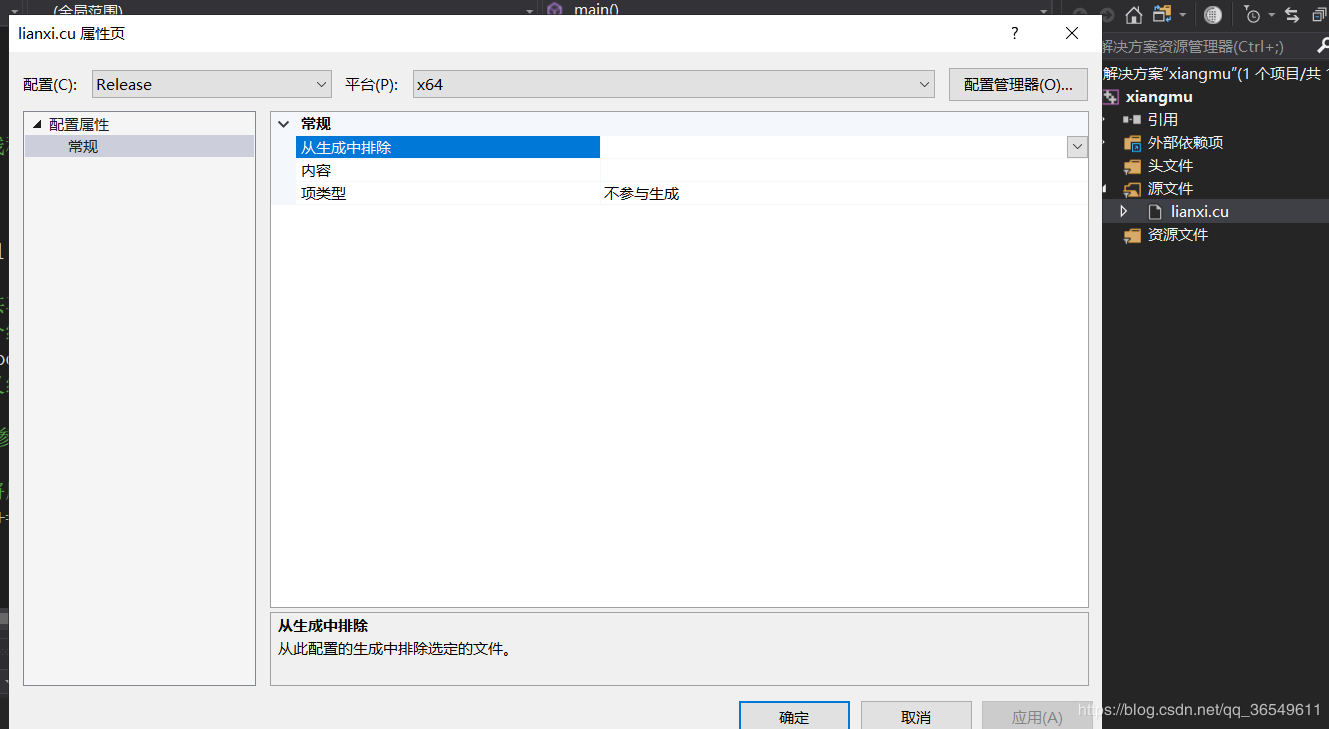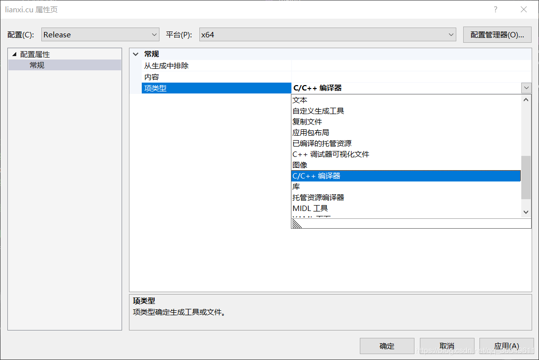7,接下来选中你所创建的源文件的属性,我所创建的是“lianxi.cu”,可以在“项类型”中找到“CUDA C/C++”,选中它,就可以进行CUDA程序的编译和调试了。