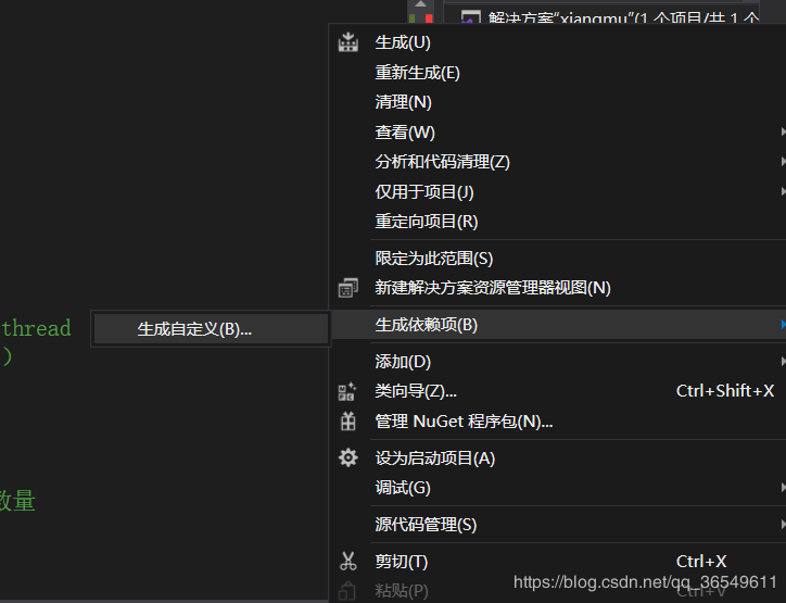 4,同样是右键“xiangmu”(就是你所建的工程),找到“生成依赖项”,选中“生成自定义”。
