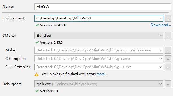 在Environment中输入之前MinGW解压文件的路径,之后下面的会自动输入,若不能自动输入,也可以手动输入: