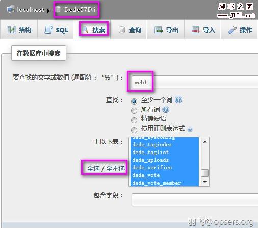 查找你安装的子目录名字,我的是web1,所以就查找他了。注意一定要选中所有的表啊,不然什么也查找不到!
