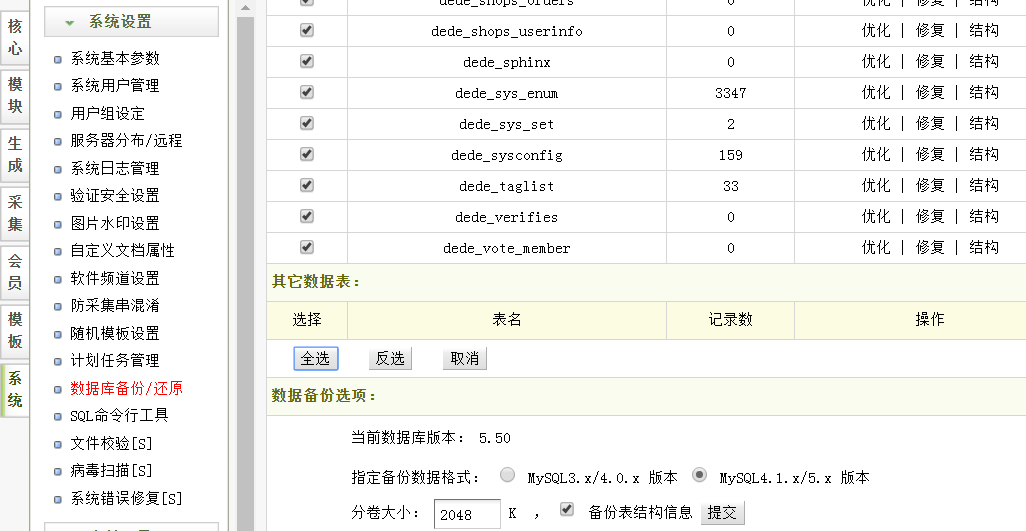 进入织梦网站后台,系统-数据备份/还原-页面拉到最下方,点击-全选-提交,就开始备份了。(数据库的备份文件存放于/data/backup_data目录下)