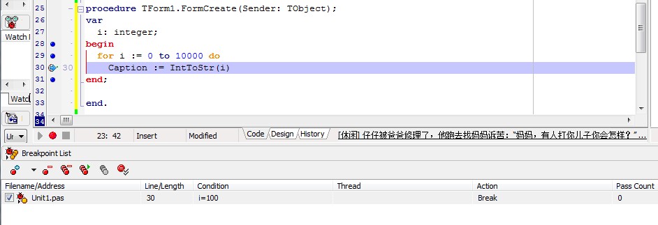 写了这么长时间的代码,一直认为调试程序比写程序要重要,上次有人问俺,如何调试一个循环中某个循环条件位置下断点。本来想来在Delphi的断点设置中应该是有一个类似条件断点的东西的,不过我也一直不知道怎么设置这个条件断点,所以当时给他们的说法是在那个循环中,加上一个条件判断,写上一个Showmessage之类的弹窗。然后弹窗之后下断点,这不外乎是一种方法,而且还是一种很SB的方法。直到今天偶然查看到Delphi的调试菜单,愕然发现,原来Delphi是可以设置条件断点的。这货在view->debug windows->BreakPoints,快捷键也就是Ctrl+Alt+B,然后显示如下