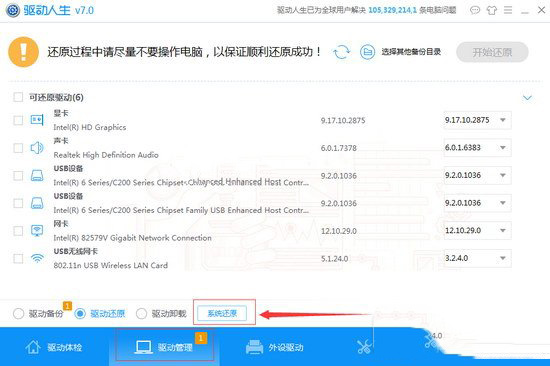 首先,打开运行驱动人生7,在驱动管理界面的左下方可以看到系统还原这个选项框,点击进入系统还原