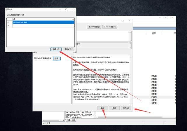 输入之后点击下列确认按钮。然后进入本地策略组--用户配置--管理模版--系统--不运行指定的Windows应用程序。即将在这里的未配置选择为已启用,然后点击现实(依次双击展开)