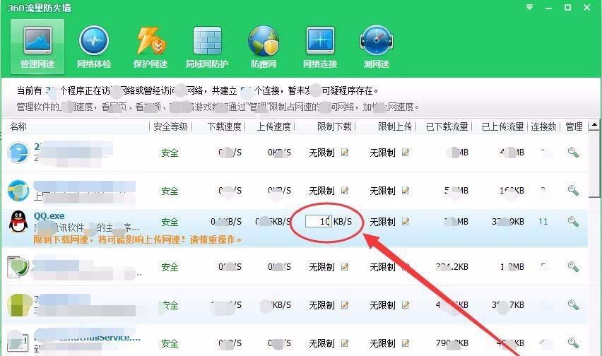 4、例如,本人将QQ的下载网速,设置为10KB每秒。