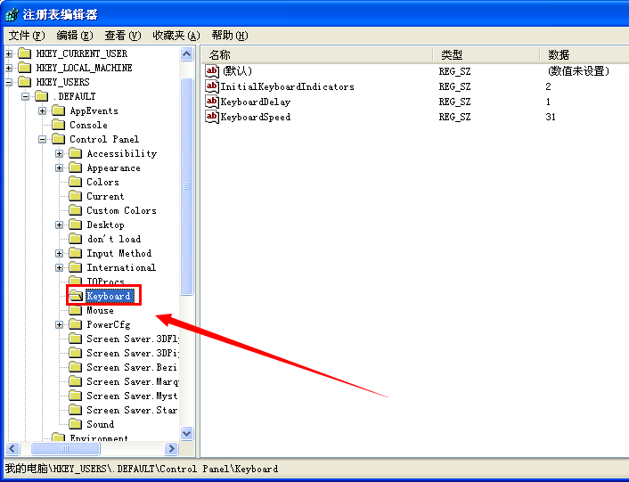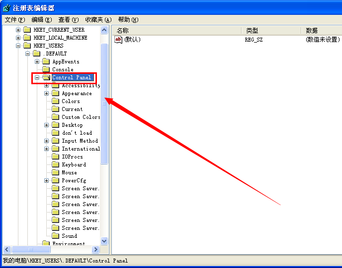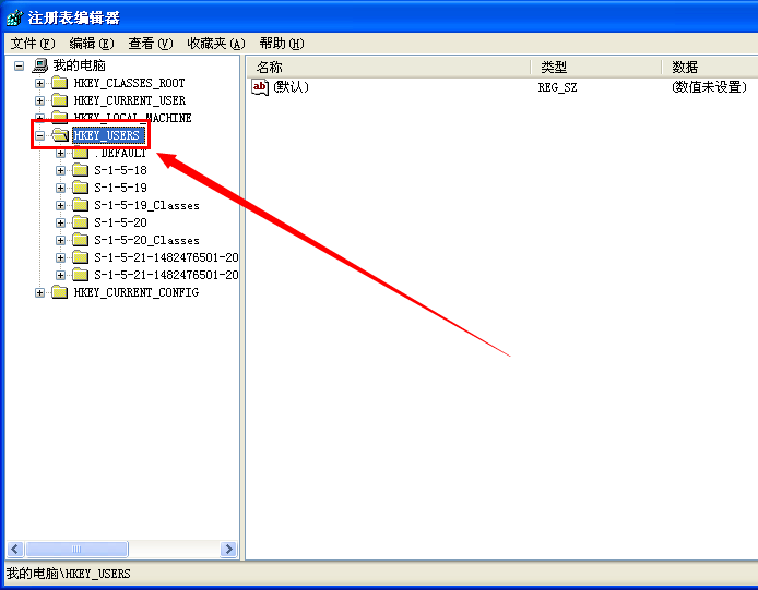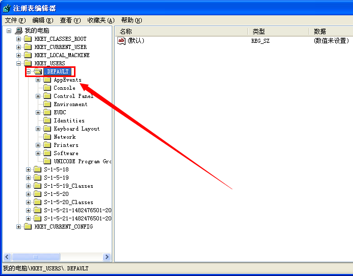 4、点[HKEY_USERS]后,再点[.DEFAULT]