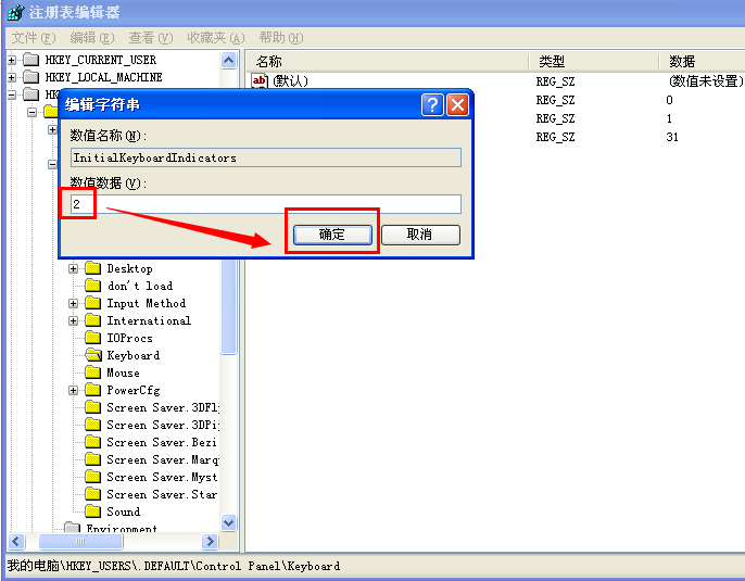 8、在弹出的窗口把[数值数据]改成2,再单击[确定],退出注册清重启电脑即可!