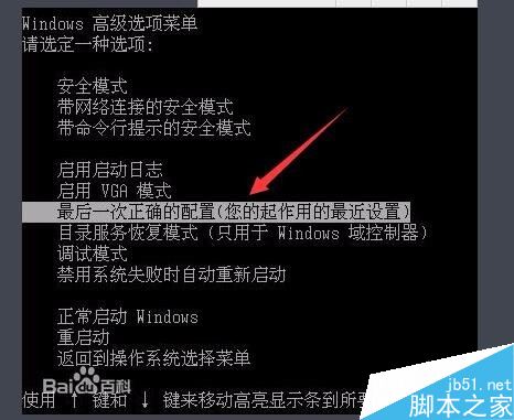 一直按f8后我们就会进入到一个界面,在这个界面上,你会看见最后一个的正确配置,如下图所示,选择这个选项,按enter键即可。