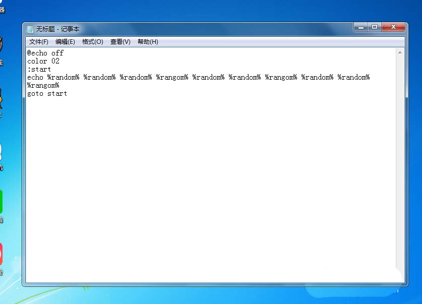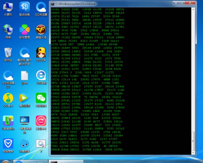 @echo off color 02 :start echo %random% %random% %random% %rangom% %random% %random% %rangom% %random% %random% %rangom% goto start