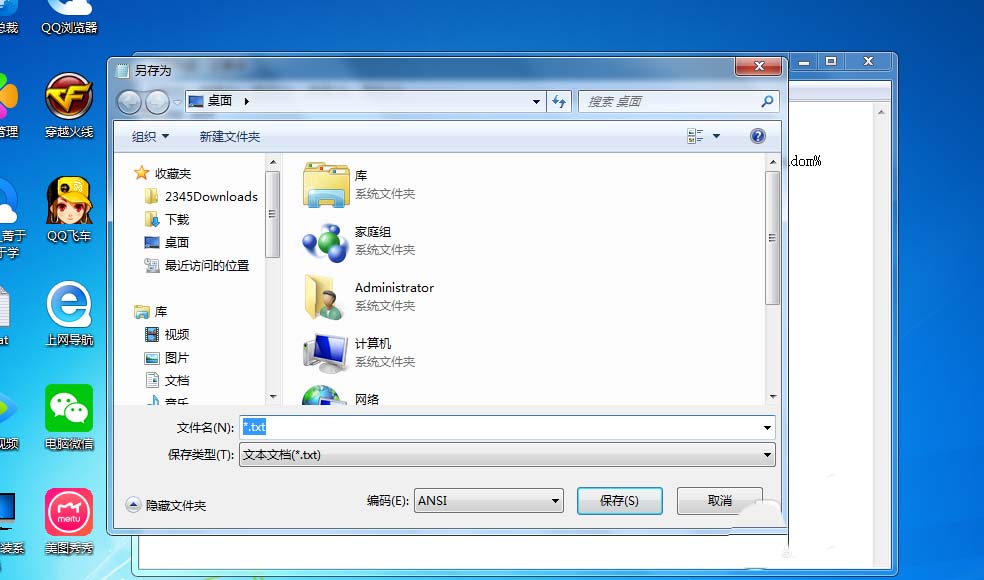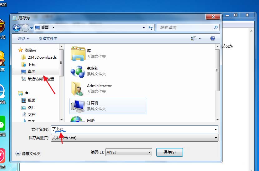 4、点击保存途径桌面,之后在文件名里随便编写一个字然后后缀+ .bat