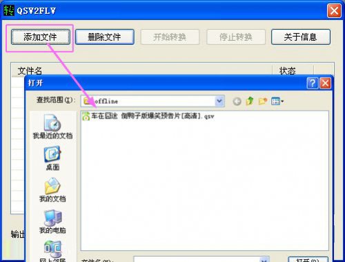 2.然后就是将下载好的qsv格式电影添加到软件中,点击左上角的“添加文件”,在弹出的界面上找到你存放qsv格式文件的文件,添加文件,如下图:
