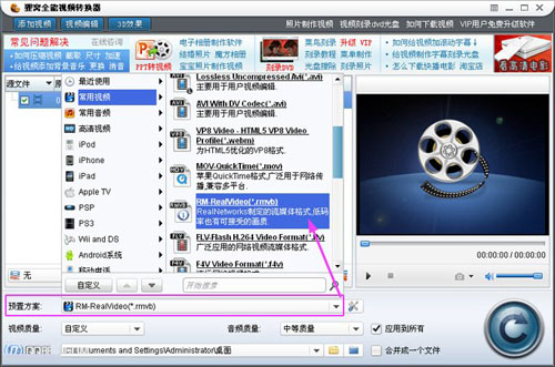 QSV格式转换器将qsv格式转换成flv格式之后,现在就利用狸窝全能视频转换器进行rmvb格式的转换,flv格式导入到转换中后,现在就开始rmvb格式转换器选择格式,选上“预置方案”右边的格式栏,然后在“常用视频”项上选择rmvb格式,如下图: