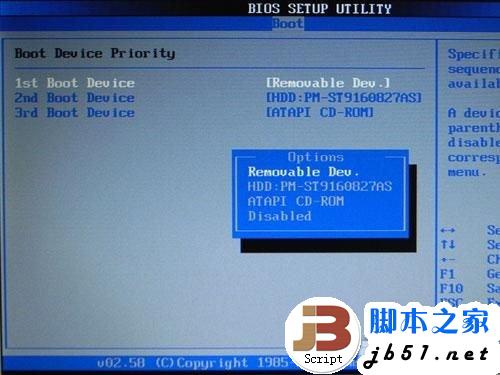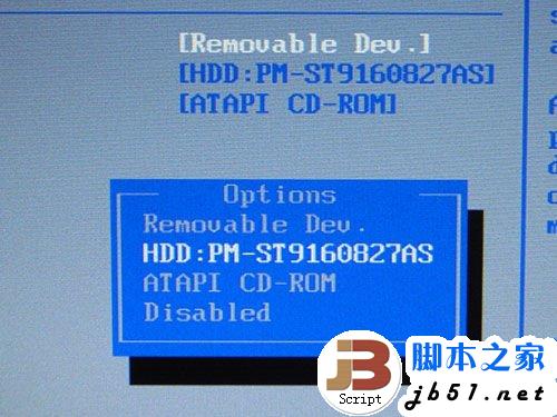 进入BIOS设置后,我们找到“BOOT”设置项来设置启动设备,也有的笔记本需要在“高级芯片组”设置项中设置,在其中我们能找到“1st Boot Device”来设置第一个启动的设备,笔者这台机器的设备显示为“Removable Dev.”显示为移动设备,各种本本之间显示的设备名称不太相同,但基本上都是选择USB或者移动设备来启动计算机。选择完毕之后我们存储BIOS设置并离开,这时计算机会重起。