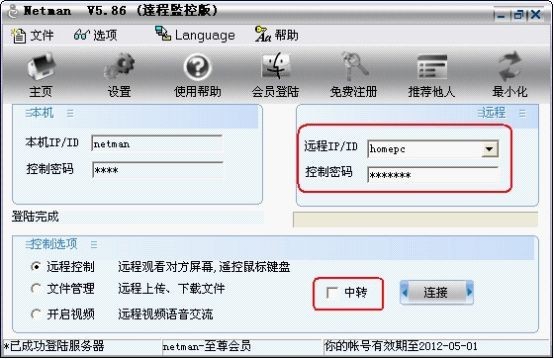 7.有同样的方法在另一台电脑安装Netman监控版并使用另一个会员登录,在“远程IP/ID”处输入对方的会员ID和控制密码,点击“连接”即可连接远程电脑。