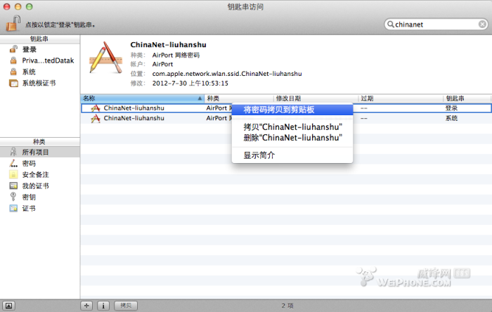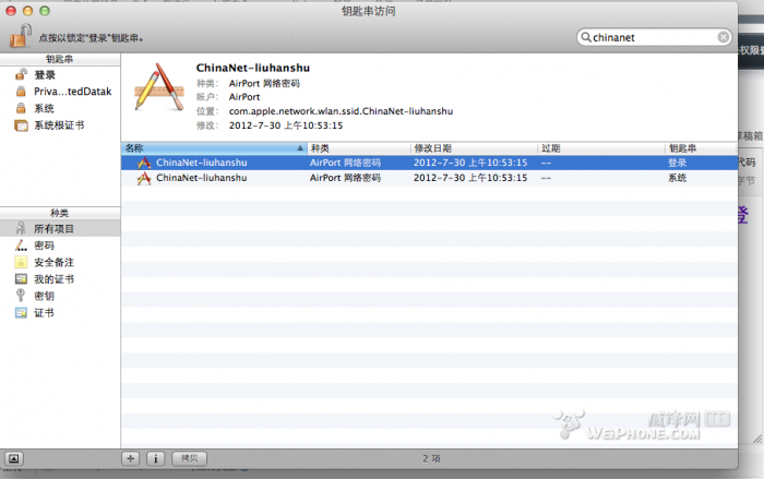首先,打开应用程序---实用工具,找到“钥匙串访问”(如果实在找不到就用spotlight搜一搜),打开之后你会看到象图中一样的东西。