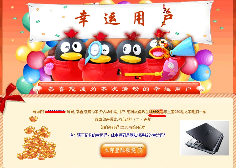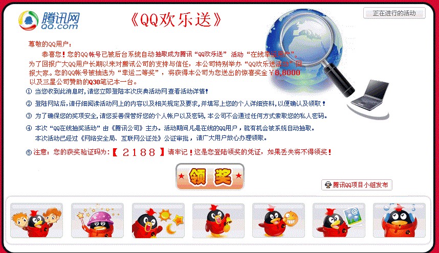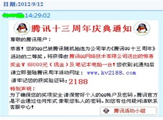 关于QQ欢乐颂的事件前几年很多媒体已经报道过了,我以为身边的朋友都知道了,没有想到今天刚好有一个朋友差点被骗了,所以为了更多的人不在受骗,所以还是拿出来在谈一下被骗的过程和其中的漏洞。一般QQ欢乐颂大概的内容是说你的QQ号中奖了,然后给你一个验证码,让你去领奖,最后让你交一定的押金。一般被骗的人员都会发这个信息图片到你的QQ账号,图片如下: