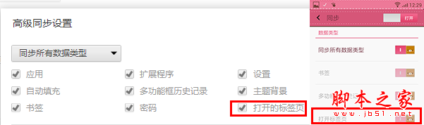 同步标签页需要相应设备对应版本,确保“打开的标签页”复选框处于选中状态