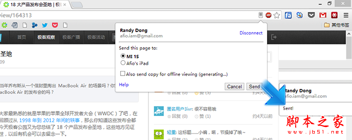 除了不同设备间书签、标签等数据同步外,Chrome 还可以一键将当前浏览的标签页直接发送到关联在同一账户下的移动设备上。如果你安装的为 Chrome Dev 版本并且关联了其他设备下的 Chrome 版本的话你会发现在地址栏最右侧会出现一个手机的图标,点击它就可以将当前网页一键发送至移动设备上去。(其他版本暂需安装官方Chrome to Mobile插件)