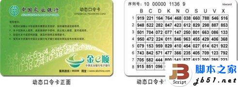 一、什么是动态口令卡?动态口令卡是农行最新推出的电子银行安全工具,是保护客户资金不受损失而设置的又一道防线。动态口令卡是为网银浏览器证书用户而提供的,目的是为浏览器证书用户在进行限额以上的支付交易时更加安全的进行网银操作。下图为动态口令卡正反面图样: