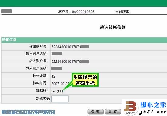 刮开动态口令卡后,您只需在动态密码框中顺序输入S5,N1所对应的口令:027468(中间不空格),然后提交即完成此笔转账支付交易,如下图:
