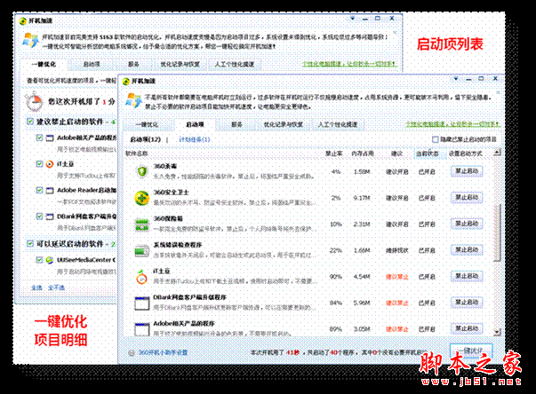 点击进入后,我们可以发现在默认界面中,详细的列出了电脑所有启动项,而且包含每个启动项的内存占用、禁止率、以及给出是否开启的建议;同时,电议一键优化标签,则可以显示将要修复的具体项目以及原因,在此,小编建议没有经验的用户使用“一键修复”按钮,既省时方便,又不会因为误操作而造成电脑问题。